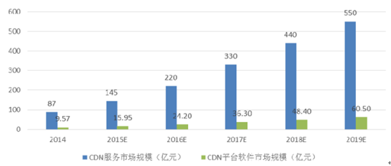 2014年中國CDN市場規模已突破80億元,預計2015年中國CDN市場規模將突破140億元,同比2014年將增長70%以上,2015至2018這三年對提供CDN服務的企業而言將是難得的發展窗口。CDN及IDC運營商在CDN平臺軟件市場的投入從2014年的9.57億元高速增加至2019年的60.5億元。