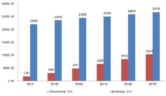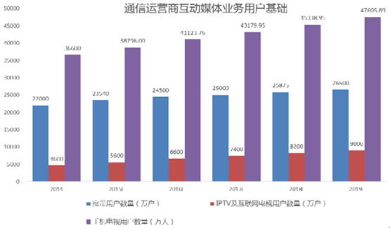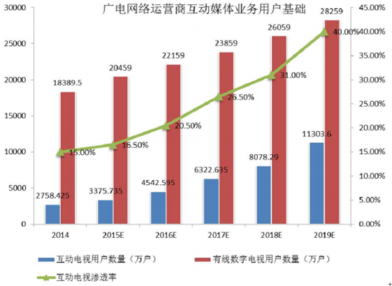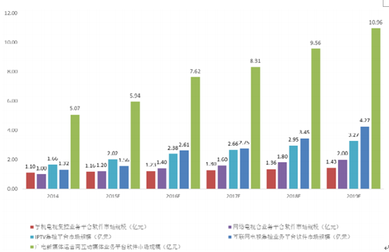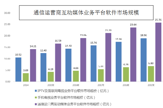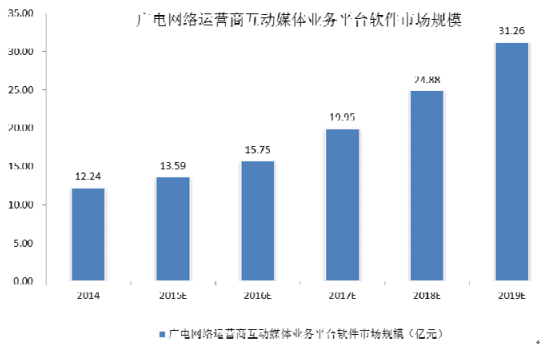 在此背景下,互動媒體業務平臺在廣電網絡運營商領域的市場規模將快速增長,隨著互動電視業務和用戶的發展,該市場規模將從 2014 年底的 12.24 億元增加到 2019 年的 31.26 億元。