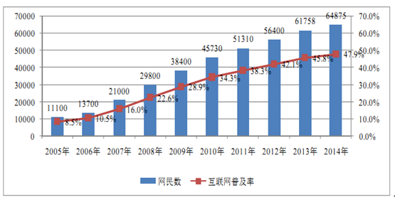 截至 2014 年 12 月,中國網民規模達 6.49 億,互聯網普及率為 47.9%。其中,手機網民規模達5.57 億,繼續保持穩定增長。在4G網絡快速發展、智能移動終端持續增長的背景下,在3G網絡進一步普及、智能手機和無線網絡持續發展的背景下,視頻、音樂等高流量手機應用擁有越來越多的用戶。截至 2013年 12 月,我國手機端在線收看或下載視頻的用戶數為 2.47 億,與 2012 年底相比增長了1.12 億,增長率高達83.8%,在手機類應用用戶規模增長幅度統計中排名第一。2014 年,在移動互聯網的推動下,個人互聯網應用發展整體呈現上升態勢。即時通信作為網民第一大上網應用,在高使用率水平的基礎上繼續攀升;微博、電子郵件等其他交流溝通類應用使用率持續走低。隨著互聯網用戶及手機網民數量的持續增長, 對通信網絡的覆蓋規模及信息數據傳輸能力提出了更高要求。
