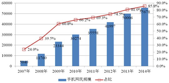 中國手機網民規模及占網民比例