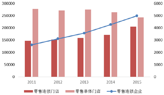 由于我國零售藥店目前集中度較低,呈現較為分散的競爭態勢。為了提升盈利能力和議價能力,零售藥店已開始呈現出規模化、連鎖化、品牌化及專業化的趨勢,大型藥品零售連鎖企業憑借其競爭優勢逐漸成為行業的主導力量,并開始對經營規模相對較小的零售藥店進行整合。近幾年來,隨著零售連鎖企業的不斷增多,零售連鎖店的數量不斷提升:11年至15年,醫藥零售連鎖企業由2607家上升至近5000家;連鎖藥店數由14.7萬家上升到20.5萬家;而單體藥店數則由11年的27.7萬家下降到24.3萬家,在藥店總數保持擴張的情況下,行業集中度卻呈現逐年提升趨勢。