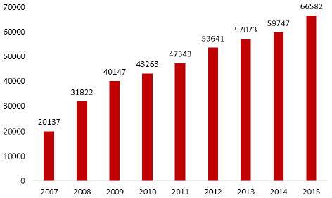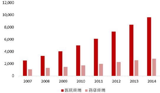 隨著人口老齡化、醫療保障制度的完善及居民收入水平的提高,我國藥品消費市場持續快速擴張。已由07年3600多億增長至14年12000多億,復合增長率達到19%,其中醫院端口14年消費總量為9600多億,07-14年復合增長率為21%,藥店端14年消費總量為2800多億,07-14年符合增長率為14%。由于體制和歷史沿革等因素影響,我國醫藥消費主要集中在醫院端口,藥店零售端只占消費總量22%左右。