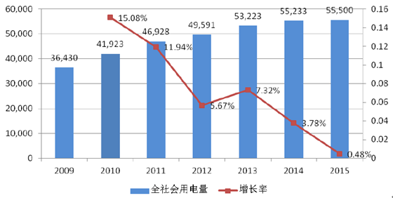 近年來,隨著中國經濟持續快速增長,用電需求迅速增長。全社會用電量自2009 年的36,430 億千瓦時增長到2015 年的55,500 億千瓦時,復合增長率達7.27%。
