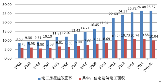 城鎮化必然帶動城鎮房屋建筑的建設,不僅直接增加城鎮住宅的需求,也必然帶來對辦公樓及商業用房等房屋建筑的需求。近年來,隨著我國城鎮房屋建筑(包括住宅)建設的發展,城鎮竣工房屋建筑面積穩定增長。2001 年-2015 年我國竣工房屋建筑面積(不含農戶)如下: