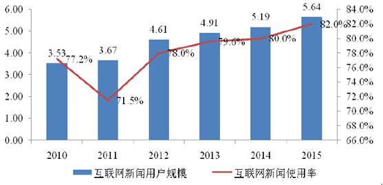 根據(jù)相關(guān)統(tǒng)計數(shù)據(jù),截至2015 年12 月,我國通過互聯(lián)網(wǎng)獲取新聞信息的用戶數(shù)已經(jīng)達(dá)到5.64 億,同比增長8.8%。隨著我國互聯(lián)網(wǎng)行業(yè)的快速發(fā)展,互聯(lián)網(wǎng)用戶規(guī)模迅速擴(kuò)大,瀏覽網(wǎng)絡(luò)新聞的用戶數(shù)量也隨之增長,網(wǎng)民逐漸養(yǎng)成通過網(wǎng)絡(luò)獲取新聞信息的使用習(xí)慣,2015 年12 月我國互聯(lián)網(wǎng)新聞的使用率達(dá)到82.0%,排在各類互聯(lián)網(wǎng)應(yīng)用使用率的第三位。