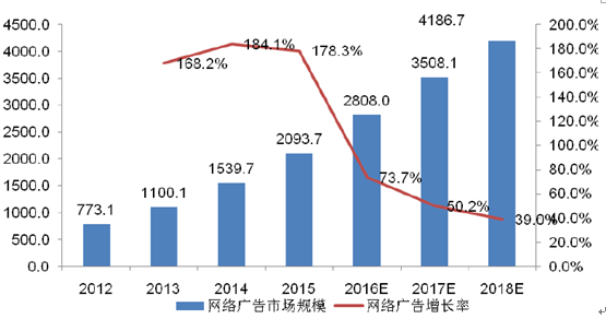 隨著我國互聯(lián)網(wǎng)網(wǎng)民規(guī)模的不斷增加,網(wǎng)絡(luò)廣告不受時間、空間影響的優(yōu)勢逐步顯現(xiàn),網(wǎng)絡(luò)廣告營銷越來越受到企業(yè)的重視。根據(jù)相關(guān)統(tǒng)計,2015 年我國網(wǎng)絡(luò)廣告市場規(guī)模達(dá)2,093.7 億元,同比增長178.3%。2012 至2015 年,我國網(wǎng)絡(luò)廣告市場規(guī)模復(fù)合年均增長率高達(dá)119.54%。