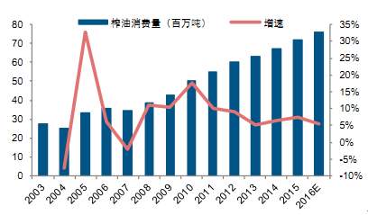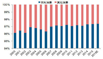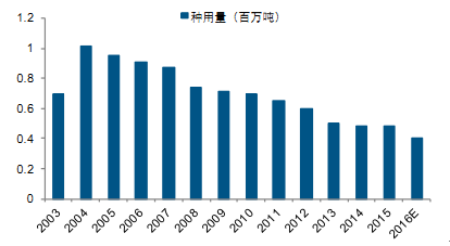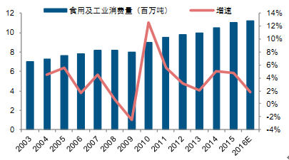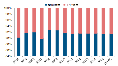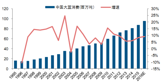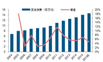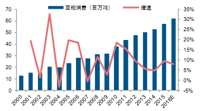 大豆需求主要來自壓榨,其拉動因素一是飼料養殖業對豆粕需求的增長,二是食用油需求的剛性增長。預計 16 年中國大豆需求繼續增長,主要基于:(1)豆粕消費中90%以上是用于各類飼料,所以飼料行業景氣度狀況對豆粕需求的影響非常明顯。隨著能繁母豬和生豬存欄量的逐漸回升以及豬價持續上漲,飼料企業將迎來銷量的全面增長,對豆粕的需求量將大幅增加。(2)豆油在我國主要用于食用,占總消費量的 85%以上,食用消費是拉動豆油消費的主要因素,隨著中國經濟企穩,豆油消費將繼續穩健增長,這些因素將帶動中國大豆需求繼續增長,預計 2016 年中國大豆消費 9525 萬噸,同比增長 9.23%。