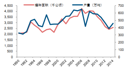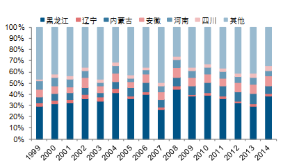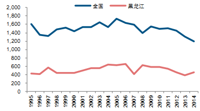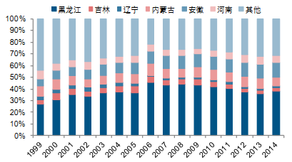 東北地區大豆質優粒大,含油率高,是我國最大的大豆生產基地。雖然東北產區大豆單產僅處于全國中游水平,但東北地區土地資源較為豐富,適合大豆等機械化種植的作物,因此東北仍是全國最主要的大豆產區。從 2009 年開始,東北大豆播種面積開始逐年下滑,其中,黑龍江是全國大豆播種面積最大的省份,近年來降幅明顯。2014 年黑龍江大豆播種面積 258 萬公頃,同比增長 6%,在經歷了連續5 年下降后略有上升,比 2008年減少 146 萬公頃,降幅達 36.2%,比 2006 年最高值減少 167 萬公頃,降幅達 39.3%。