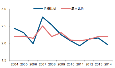 大豆玉米的價格比價從 09年超過成本比價且差距逐漸擴大