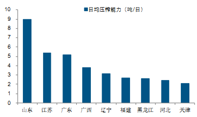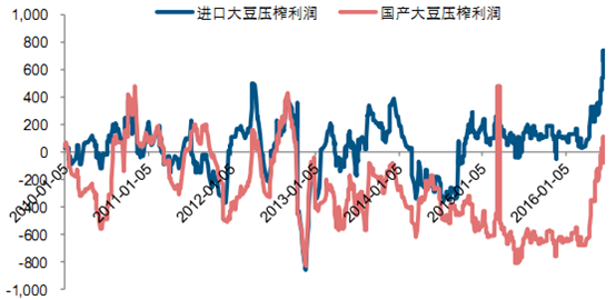 大豆進口大量增加與 2000 年以來我國大豆壓榨產能迅速擴張也有很大關系, 2000 年我國日壓榨大豆300噸以上的油廠在100家左右,全年大豆壓榨能力首次突破1000萬噸。2015 年進口大豆壓榨量為 6950 萬噸,占榨油消費總量的 96.5%。企業壓榨進口大豆具有很高的積極性,主要因為(1)進口大豆成本低,相較國產大豆具有價格優勢,因而壓榨進口大豆利潤更高;(2)壓榨企業的生產能力向沿海地區集中,地理位置方便利用加工進口大豆。