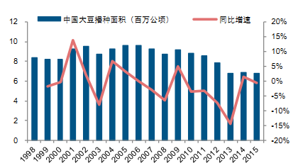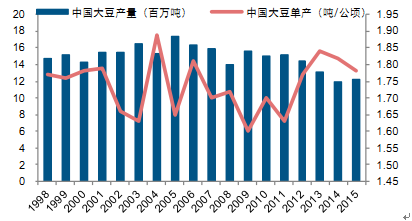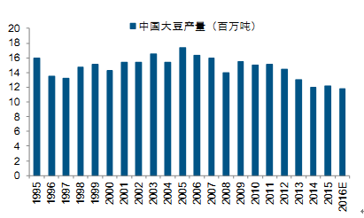 核心提示:我國大豆產量位居世界第四,從生產格局看,東北產區、黃淮海產區和南方產區是中國大豆主產區。其中,黑龍江是我國最大的大豆生產基地,大豆種植面積約占全國的 40%。2015 年中國大豆種植面積 680萬公頃,比歷史最高的 2005年減少了 279我國大豆產量位居世界第四,從生產格局看,東北產區、黃淮海產區和南方產區是中國大豆主產區。其中,黑龍江是我國最大的大豆生產基地,大豆種植面積約占全國的 40%。2015 年中國大豆種植面積 680萬公頃,比歷史最高的 2005年減少了 279 萬公頃,降幅達到 29%,15/16 年度大豆產量預計為 1180 萬噸,同比減少 2.88%,比 04/05 年度的最高值減少 560 萬噸,降幅高達 32.2%。