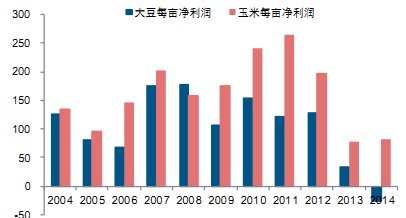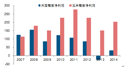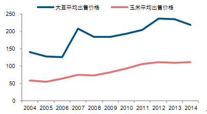 大豆種植面積自 2009 年以來不斷下滑的主要原因是大豆種植比較收益低。2009 年以來,由于玉米消費強勁,價格上漲較快,2014 年玉米平均出售價格為 112元/50 公斤主產品,比 2008 年上漲54.3%。而國產大豆市場受進口大豆擠壓,價格上漲較慢,201年大豆平均出售價格為 219 元/50 公斤主產品,比 2008 年上漲了 19.1%,漲幅遠低于玉米。因此大豆與玉米的價格比價越來越低,并自 09 年起低于成本比價且差距逐漸擴大。種植玉米的每畝凈利潤始終高于大豆,從而導致農民由種大豆改為種植效益更高的玉米。尤其是東北地區,2014年黑龍江種植玉米的每畝凈利潤為 203 元,而種植大豆的每畝凈利潤僅為 31 元,二者相差將近 6 倍。