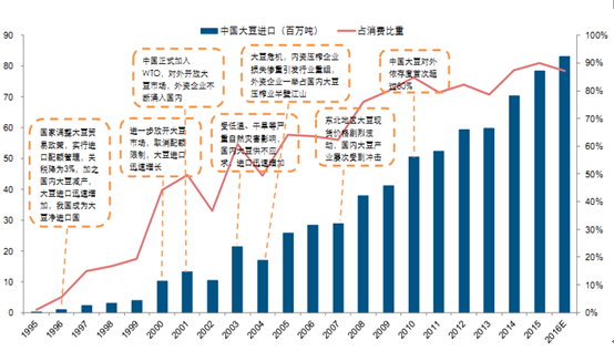 我國耕地面積基本飽和,大豆產量的增長受到了制約,而 20世紀 90 年代中后期以來,由于我國經濟保持持續快速增長,對蛋白需求的迅速增長帶動大豆需求的迅速增加,而國內大豆生產增長相對緩慢,大豆產需缺口不斷增大,增加進口成為彌補國內需求缺口的唯一選擇。1996 年是中國大豆貿易的轉折點,中國由大豆凈出口國轉為凈進口國,此后進口量逐年上升,成為全球最大的進口國。2015 年中國進口大豆 7835 萬噸,占全球大豆進口的 63.4%,是國產大豆產量的 6 倍,占國內大豆消費量的 90%左右,大豆消費對外依存度逐年提升。