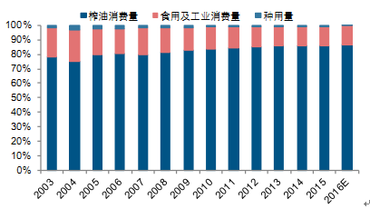 我國大豆的消費結構主要分為榨油消費、食用及工業消費和種用。2003—2015 年國內消費量持續增加,復合增長率為 7.83%;與此同時,壓榨消費量也迅速增長,復合增長率 8.4%,占國內消費量的比重穩定在 80%左右;食用及工業消費量有所增長,到 2015年達到 1100 萬噸,占國內消費的 12.7%;種用大豆消費量則有所下降,2015 年僅為48 萬噸,占國內消費的 0.56%。可以看出,我國大豆榨油消費量比重持續上升,食用及工業消費和種用比重持續下降,近年來中國大豆需求量增長的主要原因是榨油大豆需求的增加。