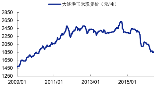 近年來國(guó)內(nèi)玉米價(jià)格盤踞高位,保持 2250 元/噸以上;2015 年第二季 度國(guó)內(nèi)玉米價(jià)格開始下滑,10 月跌至 2000 元/噸,較年初下跌 14.53%。2016 年 1 季度以 來玉米價(jià)格繼續(xù)下滑,從 2100 元/噸下跌至目前 1860 元/噸,下跌 11.4%。2015 年玉米增 收、國(guó)家臨儲(chǔ)結(jié)余高筑,庫(kù)存消費(fèi)比高位難下,在出口短期難以增加的情況下,預(yù)計(jì) 2016 下半年國(guó)內(nèi)玉米價(jià)格將維持低位震蕩。