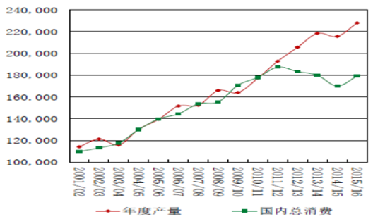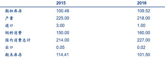 根據(jù)農(nóng)業(yè)部最新玉米供需平衡表預(yù)測(cè),2015/16 年度中國(guó)玉米飼用消費(fèi)為 10600 萬噸,玉米工業(yè)消費(fèi)量為 5100 萬噸,2016/17 年度玉米飼用消費(fèi) 13200 萬噸,玉米 工業(yè)消費(fèi)為 6500 萬噸,食用及其他消費(fèi) 1800 萬噸。進(jìn)出口方面,由于玉米價(jià)格下降,國(guó)內(nèi)玉米的進(jìn)口替代隨著大幅縮減,預(yù)計(jì) 2015/16 年度玉 米進(jìn)口量 330 萬噸。