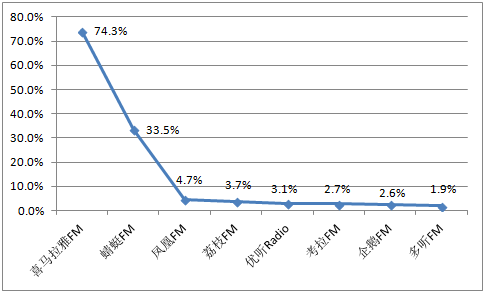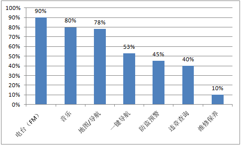 對車主日常使用的功能調研數據顯示,電臺、音樂、地圖/導航、一鍵導航是最常使用的增值服務,我們將此類功能應用定義為高頻服務(50%作為分水嶺)。 其中,車主中對電臺(FM )的使用率高達90%,因此,車主對電臺APP廠商來講,是精準的高端用戶。