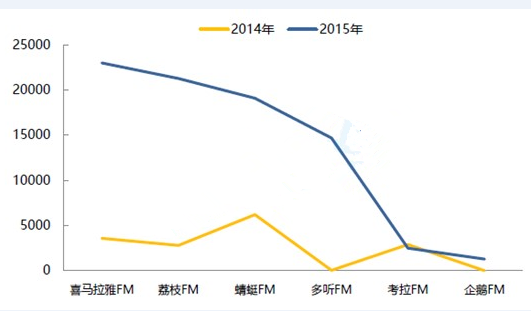 蜻蜓FM、喜馬拉雅FM和考拉FM等由于上線時間較早,在2014年就受到的關注度較高,搜索指數也明顯趨高。音頻較視頻“吸金”能力弱,尤其在商業變現是困擾行業發展的核心議題,近兩年移動電臺企業不斷跑馬圈地,當進軍車聯網市場、可穿戴設備和智能硬件等領域時,得到行業和大量資本的關注。不過,也暴露了音頻版權問題,因此,2015年,喜馬拉雅FM、蜻蜓FM、荔枝FM、考拉FM和多聽FM等開始花更多的精力加強版權控制,也通過產品創新提升了搜索度。