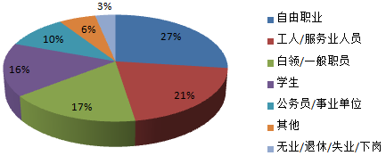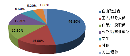 80后、85后車主占比高達61.1%,車主中使用移動互聯網應用的人群呈年輕化趨勢;自由職業者占車主的46.8%,是目前的主力人群;其次是工人/服務人員、白領和公務員的車主比例相差不大,共占39.9% 。