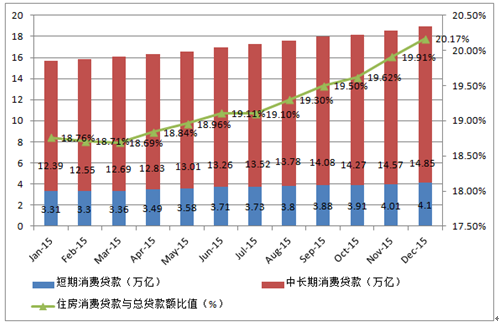 2015年12月,我國金融機(jī)構(gòu)人民幣信貸余額為93.95萬億,住戶部門消費(fèi)信貸余額為18.95萬億元,占比20.17%,比1月份提升了1.41個(gè)百分點(diǎn),增長迅速。