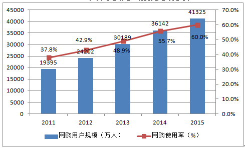 2011-2015年中國網(wǎng)購用戶規(guī)模及網(wǎng)購使用率