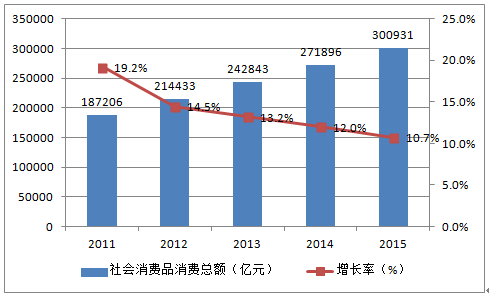 2011-2015年我國社會(huì)消費(fèi)品零售總額