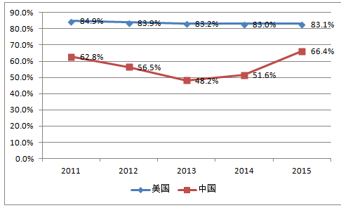 2011-2015年中美最終消費(fèi)對經(jīng)濟(jì)貢獻(xiàn)率對比