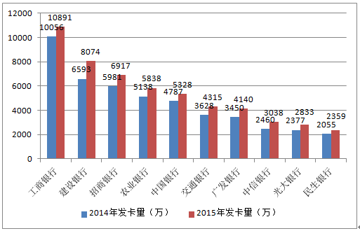 2014-2015年累計(jì)發(fā)卡量TOP10銀行