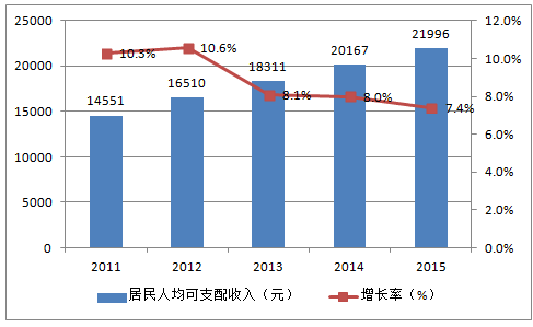 2015 年中國社會(huì)消費(fèi)品零售總額為300931 億元,同比名義增長10.7%(扣除價(jià)格因素,實(shí)際增長10.6%),我國居民人均可支配收入2015年達(dá)到21996元,同比增長7.4%,超過GDP增速,為居民消費(fèi)需求和消費(fèi)支出增長提供了事實(shí)上的基礎(chǔ)。
