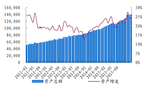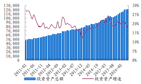 2011-2016年中國保險行業投資資產總額(億元)及增速