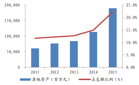 截止2016年5月,行業總體資金運用余額超過12萬億元,其中其他投資占比33.41%,所占可投資產比例持續創新高。由于目前尚未披露其他投資的具體科目,但從其他幾項資產的界定,銀行存款、債券和股票基金基本可以認為是保險公司最傳統的配置,因此可以先將其他投資的增長當做保險公司對另類資產的配置。就目前的趨勢來看,其他投資的占比和配置情況正在逐步向上,這意味著另類投資規模也潛在增長。