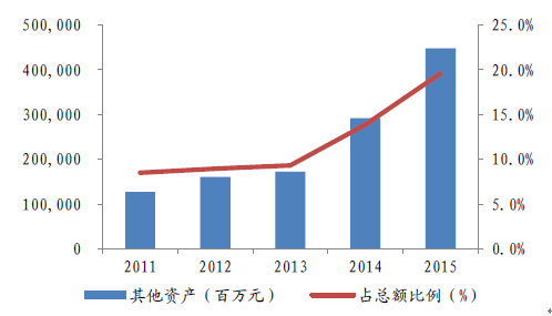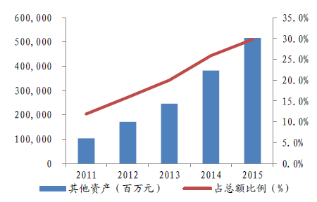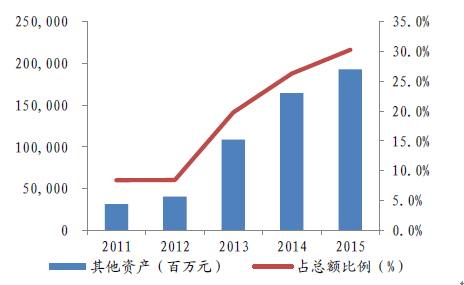 以保監會口徑統一,四家上市公司的其他類資產規模與占比也持續提升。截止2015年,四家公司其他類資產占比19.6%-30.3%。無論是規模還是占比均創近幾年新高。