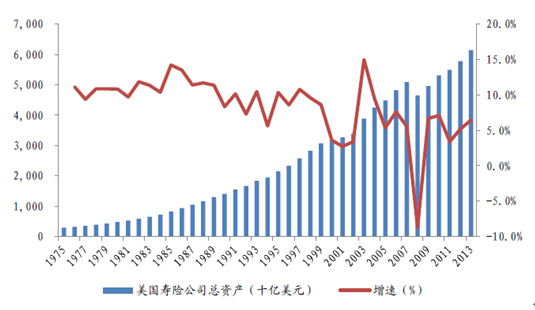我國保險行業作為重要的資金配置行業,總資產及投資資產不斷攀升。截止2016年5月,行業總資產接近14萬億元,投資資產(不含銀行存款)9.9萬億元,較5年前分別增長161%和192%。同時,兩類指標的增速也保持在15%-20%的水平,未來增長趨勢不減。保險總資產與投資資產的穩健增長,是不斷積累的經濟增長和旺盛的投資需求結合的結果。對比美國,其保險市場已較為成熟,截止2013年美國壽險公司總資產就高達6.15萬億美元,但其歷史資產增速呈現明顯先揚后抑態勢。1990年前,美國壽險資產增速基本維持在10%以上,但此后增速不斷下滑,08年伴隨金融危機更是一度出現負增長。考慮到美國的經濟發展已進入成熟期,我國仍處于上升期,僅以壽險市場資產對標,仍有50%以上的增長空間。