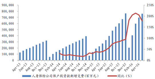 面臨資產荒的不僅是保險公司,客戶也有同樣的理財需求,也想尋求穩定的投資收益。縱然保險公司自身也面臨投資壓力,但從跟蹤的產品來看,提供給客戶的投資回報仍然是比較穩定的,5月的年化投資收益率為3.8%-4.5%,仍然高過當前利率不少,并未受到近期市場震蕩而產生影響。而相對來說,保險公司本身專業的投資素質對于客戶而言就是一種投資選擇。保監會從13年4月開始統計保戶投資款新增交費,這一指標也快速上升。截止16年5月,保戶投資款新增交費7596.3億元,同比高增178.24%。這也說明資產荒下,客戶對于保險理財的需求旺盛。