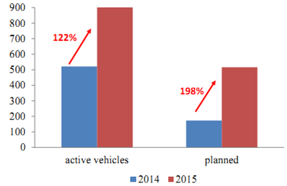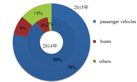 目前全球燃料電池車快速增長,2015 年投入運營的數量增速達到 122%,計劃增加的數量增速達到 198%。從占比看,乘用車最大,占據了80%左右的份額,產業化正在加速推進。
