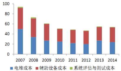 經過多年的發展,燃料電池堆和輔助系統技術和工藝更加成熟,成本逐年下降,燃料電池車動力系統的總成本也隨之持續下降,現在成本較07 年下降了將近一半。