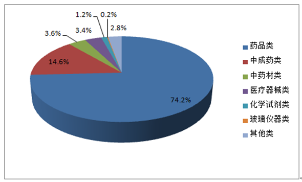 3、按銷售品類分類,藥品類3銷售居主導地位,銷售額占七大類醫藥商品銷售總額的74.2%,其次為中成藥類占14.6%,中藥材類占3.6%,醫療器械類占3.4%,化學試劑類占1.2%,玻璃儀器類占0.2%,其他類占2.8%。