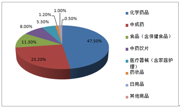 據中國醫藥商業協會典型樣本城市零售藥店2015年品類銷售統計,零售藥店銷售額中的藥品類占主導地位,占零售總額的80.7%,其中化學藥品占47.5%、中成藥占25.2%、中藥飲片占8.0%;非藥品銷售占19.3%,其中食品(含保健食品)占11.3%,而藥妝品、日用品和其他商品這三類總占比不足3%。