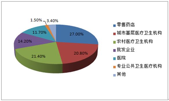 按銷售渠道分類,2015年對批發企業銷售額為6936億元,占銷售總額的41.8%,比上年降低1個百分點;對終端銷售額為9677億元,占銷售總額的58.2%,比上年增加1個百分點;其中對醫療機構銷售額為6907億元,占終端銷售額的71.4%,對零售終端和居民零售銷售額為2770億元,占終端銷售額的28.6%。