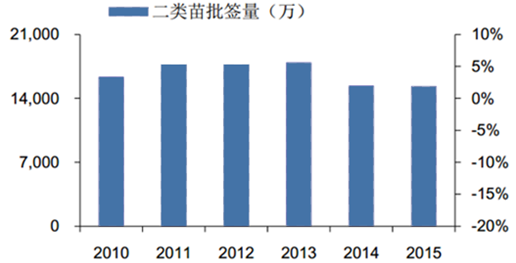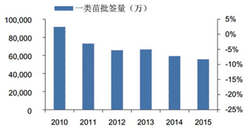 2015年,疫苗批簽量為7.04億份,同比下降5.34%。其中一類疫苗批簽發的主要有流腦、乙腦、百白破、乙肝、麻風腮、脊灰、卡介苗、甲肝等疫苗,二類疫苗簽發的主要狂犬、流感、Hib、水痘等疫苗。