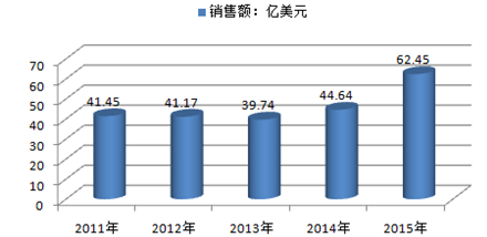2011-2015年全球默沙東 HPV 疫苗 Gardasil售額規模