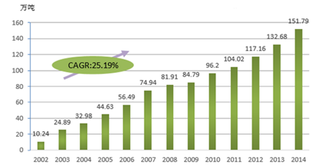 2002 年以來,速凍魚糜制品產量高速增長,至 2014 年已達 151.79 萬噸,