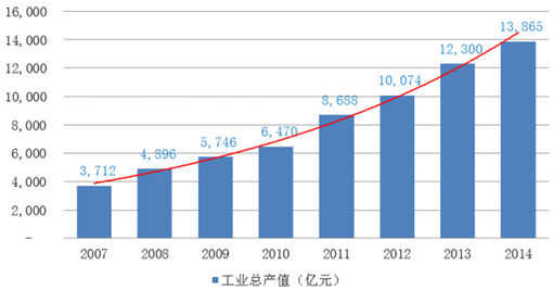 2007年至2014年,我國重型機械行業(yè)工業(yè)總產(chǎn)值總體保持了穩(wěn)步增長態(tài)勢,2014年重型機械行業(yè)工業(yè)總產(chǎn)值達13,865億元,同比增長了12.72%。
