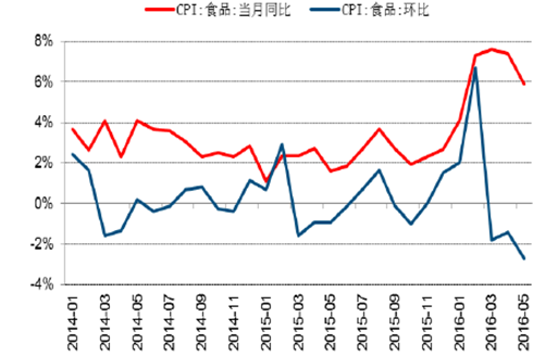 2014-2016年中國食品CPI當月同比及環比