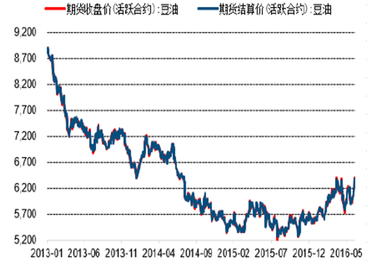 2013-2016年豆油期貨活躍合約收盤價(元/噸)