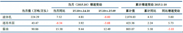 從經濟數據看,2015年1-10月,食品制造業主要子板塊收入和利潤全部實現正增長。速凍食品、調味品和葡萄酒累計收入增速最快,分別為14.60%、8.94%和8.55%,白酒的累計收入增速也達到7.75%。從累計利潤增速看,調味品增速最高,達到20.22%;含乳和植物蛋白飲料增長15.36%,葡萄酒增長14.79%,白酒和速凍食品的利潤增速慢于收入,分別增長5.51%和8.95%,主要是受行業競爭格局和成本影響。