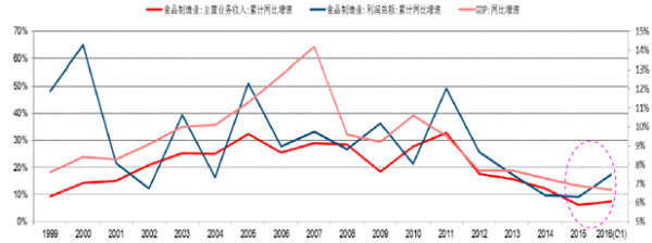 1999-2015年食品制造業收入及利潤增速(左軸),GDP增速(右軸)
