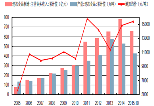 2005-2015年中國速凍食品營收、產量及銷售均價測算