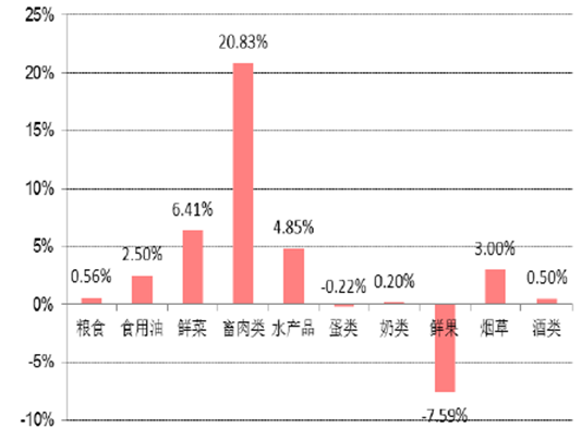 環比分類來看,5月份,食品煙酒價格環比下降1.8%,影響CPI下降約0.54個百分點。其中,畜肉類價格上漲1.6%,影響CPI上漲約0.08個百分點(豬肉價格上漲2.3%,影響CPI上漲約0.07個百分點);5月份應季鮮菜大量上市,使得鮮菜價格下降21.5%,影響CPI下降約0.64個百分點;鮮果價格下降1.3%,影響CPI下降約0.02個百分點。