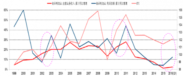 歷史數據表明,在物價上漲初期,溫和通貨膨脹會在一定程度上刺激食品需求且食品制造業的利潤增速隨之上升,例如2002—2003年和2009—2010年,CPI上漲的同時,食品制造業利潤增速也呈隨之攀升。2011年后食品制造業的利潤總額增速與CPI幾乎同步從高位持續回落。CPI在經歷4年下降后,2016年至今開始觸底小幅回升。我們認為今年若能保持溫和通脹,食品制造業將因此受益,行業利潤將實現加速增長。